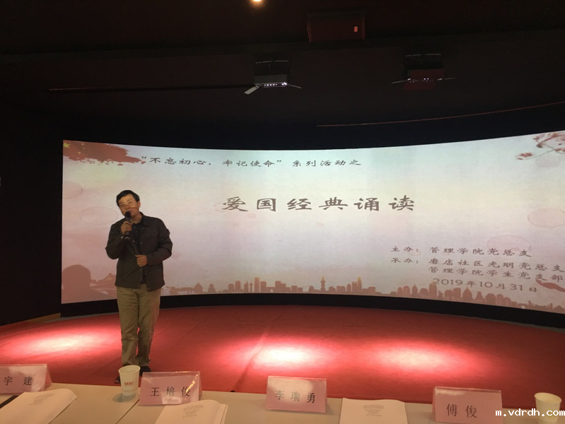 为引导广大党员悟初心、守初心、践初心,营造“不忘初心、牢记使命”主题教育浓厚氛围,10月31日晚,由管理学院党总支主办,磨店社区光明党总支、管理学院学生党支部承办的“不忘初心、牢记使命”系列活动之《爱国经典诵读》主题党日活动在教E副楼3D导游实训室举办。磨店社区光明党总支第二党支部书记、光明社居委主任宇健,光明党总支总支委员、第二党支部书记许文俊,管理学院党总支书记、院长王培俊,党总支副书记李瑞勇、学生党支部全体党员及第31和33期全体入党积极分子参加活动。