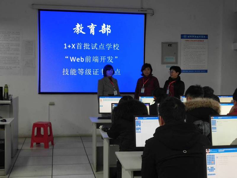 本网讯(实训中心通讯员 吴家奎 信息工程学院通讯员 李军)12月21日,2019年全国首批Web前端开发“1+X”职业技能等级认证考试在我校信息工程学院二楼实训室顺利开考,共有128名信息工程学院学生参加认证考试。党委委员、副校长史锋亲临考核现场指导工作。实训中心负责人冯本茹,信息工程学院负责人李京文现场督考。